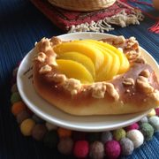 高粉、牛奶、糖、酵母、盐、黄油、奶粉、黄油、低粉、糖粉、黄桃。