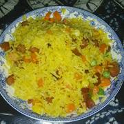 米饭、鸡蛋、火腿肠、玉米、碗豆、胡萝卜、盐、油。
