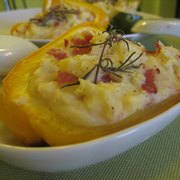 土豆、甜彩椒、培根、鲜奶油、芝士、黄油、香草。