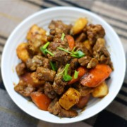 排骨、土豆、红萝卜、八角、料酒、酱油、李锦记豆鼓香辣酱、糖、葱花。