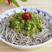 苦荞麦面条、青椒、芹菜、油、盐、姜、蒜、蚝油、蚕豆瓣。