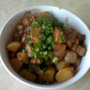 五花肉、土豆、八角、红糖、砂糖、盐,味精、葱花。
