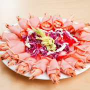 大虾、火腿片、玫瑰花瓣、沙律酱、伴碟。