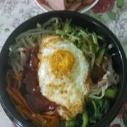 米饭、胡萝卜,小油菜,绿豆芽,金针菇,黄瓜,韩式辣酱。