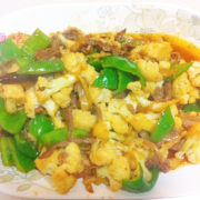 花菜、肉丝、青椒、大葱、姜、蒜头、干辣椒、虾米。