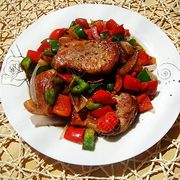 猪里脊肉、青椒、红椒、洋葱、黑胡椒粉、大喜大烤肉酱。