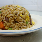 米饭、胡萝卜、豌豆、洋葱、鸡蛋、食用油、生抽。