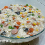 皮蛋、豆腐、肉肠、胡萝卜、豌豆、甜玉米、盐、水、淀粉。