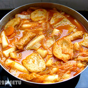 年糕、泡菜、鱼饼、洋葱、大葱、胡萝卜、白菜、水、油、韩国辣酱。