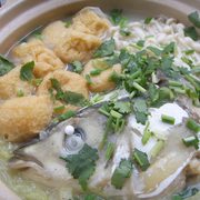 鱼头、豆腐泡、豆腐、白菜、金针菇、葱、香菜。