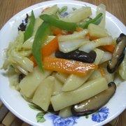 年糕、白菜、红萝卜、青椒、泡发冬菇、姜丝。