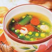 海鲜浓汤宝、鲜豌豆、虾仁、胡萝卜、蒜蓉、水淀粉、盐。