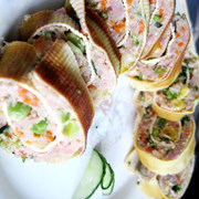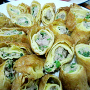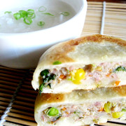 面粉、猪肉、豌豆、熟玉米粒、胡萝卜、香菜、鸡蛋、葱、料酒、酱油、糖、盐、姜、蒜。