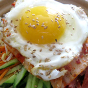 剩米饭、菠菜、鸡蛋、黄瓜、豆芽、胡萝卜、辣白菜、哈尔滨红肠、淀粉、韩式辣酱、熟芝麻、油。