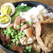 五花肉、鸡蛋、水豆腐、豌豆、油菜、葱姜蒜、卤汁、酱油、八角、桂皮、白糖、盐、料酒、香叶。