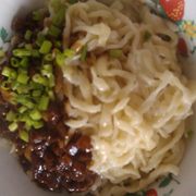 六必居干黄酱、六必居甜面酱、时令蔬菜、手擀面、五花肉、油,糖,鸡粉。