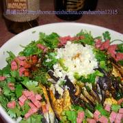茄子、蒜、香菜、尖椒、孜然肠、酱油、丁香香叶水、花生油。