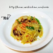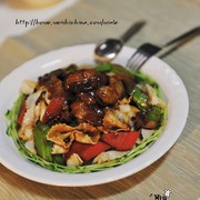 蝴蝶面、五花肉、胡萝卜、芥菜杆、青辣椒、甜面酱、豆瓣酱、水、盐、油。