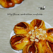 高筋面粉、细砂糖、干酵母、盐、水、黄油、奶油奶酪、细砂糖、柠檬汁、饼干屑、杏仁片、蛋液。