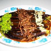 圆茄子、猪瘦肉、尖椒、蒜、淀粉、食用油、清水、白糖、甜面酱、料酒、酱油、香油、盐、鸡精。