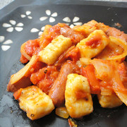 熟土豆、面粉、鸡蛋、小香肠、西红柿、洋葱、黑胡椒、盐、番茄酱。