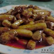 猪肉、年糕、鸡蛋、花生油、蚝油、生粉、番茄酱、自制辣椒油、糖。