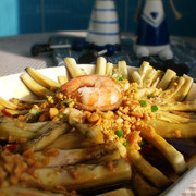长茄子、香菇、鲜虾仁、油炸花生米、盐、葱、剁椒、蚝油、生抽、淀粉、糖、盐、清水。