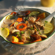 花蛤、柠檬、牛腩、玉米、胡萝卜、白胡椒粉、姜、盐、香油 、香菜末。