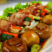 双孢菇、金针菇、培根、黄瓜、胡萝卜、生菜、姜、蒜。