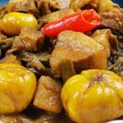 五花肉、干豆角、葱、姜、蒜、八角、生板栗、野山菇、食用油、冰糖、盐、生抽、老抽、料酒、朝天椒。