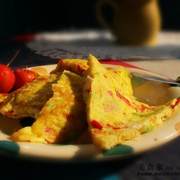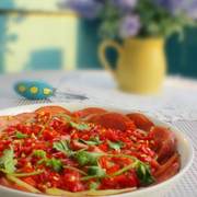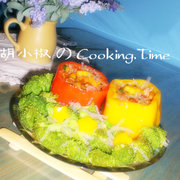 红黄彩椒盅、西兰花、藕丁、黄瓜丁、彩椒丁、香菇 丁、黄豆酱 橄榄油、番茄酱、盐。