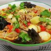 羊肉片、土豆、老汤、鹌鹑蛋、葱、香菜、剁椒、火锅底料、老抽、木耳、盐。
