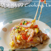 9寸披萨饼皮、金枪鱼罐头、培根、彩椒、洋葱、鲜虾仁、马苏里奶酪丝、橄榄油、黑胡椒碎、甜玉米粒。