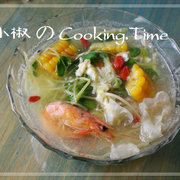 鲜虾、玉米、银耳、清水、枸杞子、鸡蛋、香油、豌豆苗、淀粉、盐。