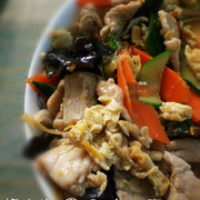 猪肉、黄瓜、胡萝卜、黑木耳、黄花菜、鸡蛋、蒜、食用油、料酒、白糖、盐、生抽、淀粉、清水。