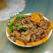 南瓜、五花肉、葱、姜、蒸肉粉、辣椒粉、胡椒面、糖、生抽、料酒、蚝油。
