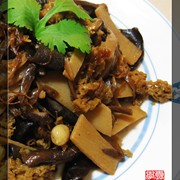 烤麸干、香菇、清水竹笋、黄花菜、黑木耳、黑木耳、花生米、盐、生抽、老抽、糖、纯香麻油。