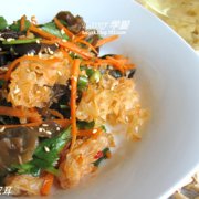 木耳、银耳、红萝卜丝、蒜粒、香菜、葱花、芝麻粒、酱油、盐、醋、糖、香油、辣椒油。