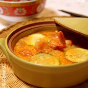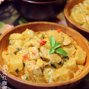 鸡肉、土豆、九层塔、洋葱、椰奶、红咖喱酱、酸橙汁、酸橙叶。