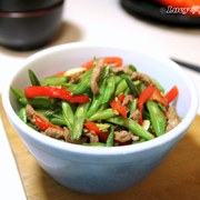 嫩四季豆、猪肉丝、甜椒、姜、蒜、料酒、生抽、盐、糖。