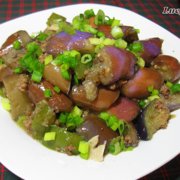 茄子、青椒、蒜片、姜末、葱花、牛肉末。