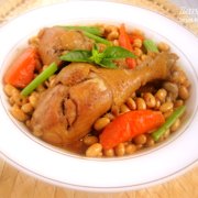鸡腿、黄豆、八角、红萝卜、花椒、葱、姜、蒜、料酒、酱油、老抽、糖、盐。