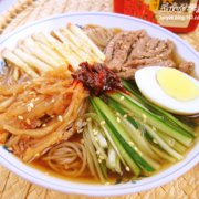 荞麦面、牛肉、葱、姜、苹果、韩国辣白菜、黄瓜、煮鸡蛋、芝麻。