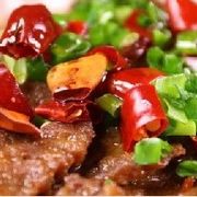 黄牛肉、淀粉、干辣椒、油、鸡精。