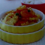 虾仁、鸡蛋清、剩米饭、豌豆、姜片、淀粉、番茄酱、白砂糖、色拉油、盐。