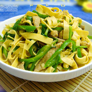 青椒、豆皮、瘦肉、油、盐、姜、料酒、生抽、糖、淀粉、胡椒粉。
