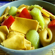 豆皮、红椒、水瓜、蒜、油、盐、酱油、胡椒粉、鸡精。