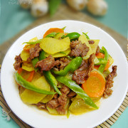 牛肉、辣椒、土豆、胡萝卜、姜、料酒、酱油、鸡精、淀粉、盐。