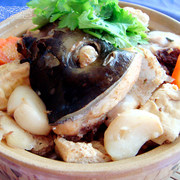 鱼头、冻豆腐、大蒜、葱、姜、洋葱、胡萝卜、鲜贝露、白胡椒粉、蒸鱼豉油、植物油、料酒、盐、香菜。