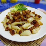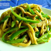 杏鲍菇、青椒、瘦肉、油、盐、酱油、鲜贝露、白糖、料酒。